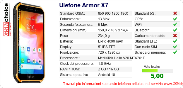 Dati del telefono cellulare Ulefone Armor X7 sul tuo sito