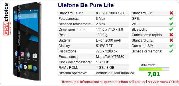 Dati del telefono cellulare Ulefone Be Pure Lite sul tuo sito