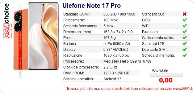 Dati del telefono cellulare Ulefone Note 17 Pro sul tuo sito