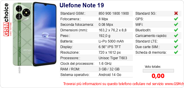 Dati del telefono cellulare Ulefone Note 19 sul tuo sito