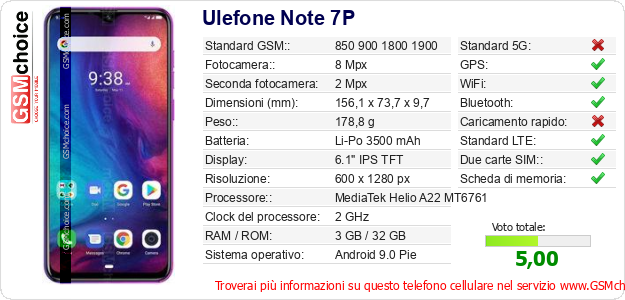 Dati del telefono cellulare Ulefone Note 7P sul tuo sito