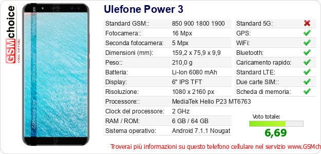 Dati del telefono cellulare Ulefone Power 3 sul tuo sito