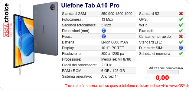 Dati del telefono cellulare Ulefone Tab A10 Pro sul tuo sito