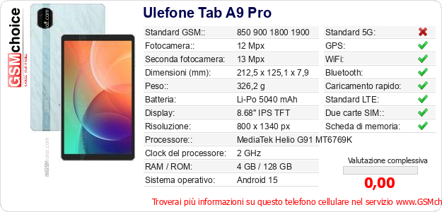 Dati del telefono cellulare Ulefone Tab A9 Pro sul tuo sito