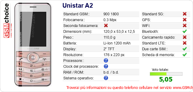 Dati del telefono cellulare Unistar A2 sul tuo sito