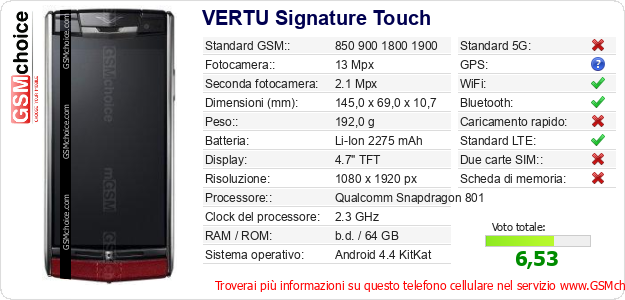 Dati del telefono cellulare VERTU Signature Touch sul tuo sito