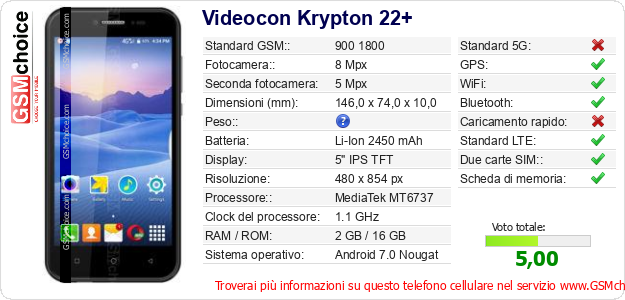 Dati del telefono cellulare Videocon Krypton 22+ sul tuo sito