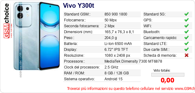 Dati del telefono cellulare Vivo Y300t sul tuo sito