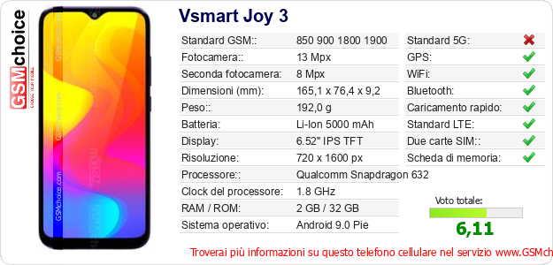 Dati del telefono cellulare Vsmart Joy 3 sul tuo sito