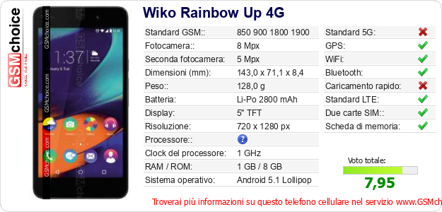 Dati del telefono cellulare Wiko Rainbow Up 4G sul tuo sito