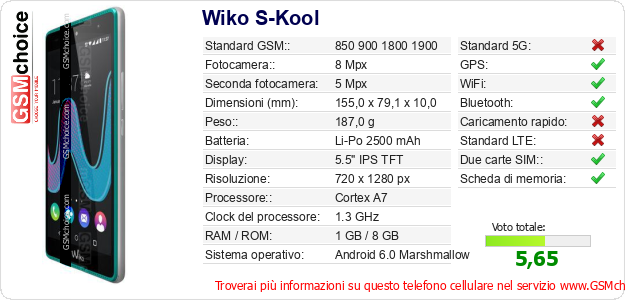 Dati del telefono cellulare Wiko S-Kool sul tuo sito