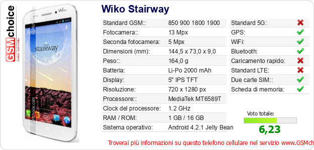 Dati del telefono cellulare Wiko Stairway sul tuo sito