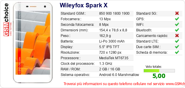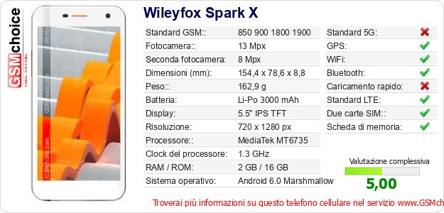 Dati del telefono cellulare Wileyfox Spark X sul tuo sito