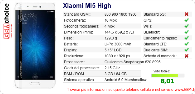 Dati del telefono cellulare Xiaomi Mi5 High sul tuo sito