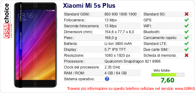 Dati del telefono cellulare Xiaomi Mi 5s Plus sul tuo sito
