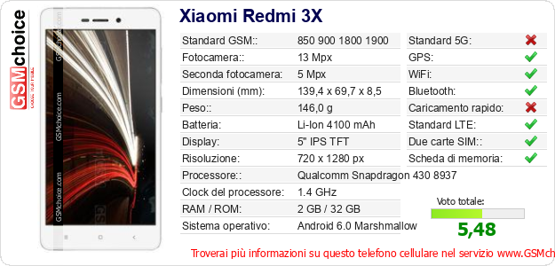 Dati del telefono cellulare Xiaomi Redmi 3X sul tuo sito