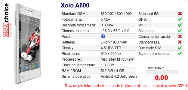 Dati del telefono cellulare Xolo A600 sul tuo sito