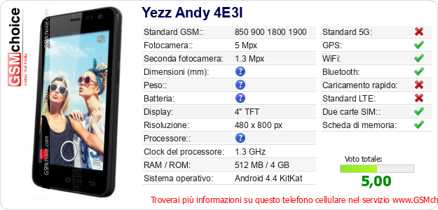 Dati del telefono cellulare Yezz Andy 4E3I sul tuo sito