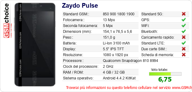 Dati del telefono cellulare Zaydo Pulse sul tuo sito