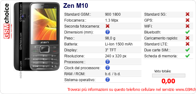 Dati del telefono cellulare Zen M10 sul tuo sito