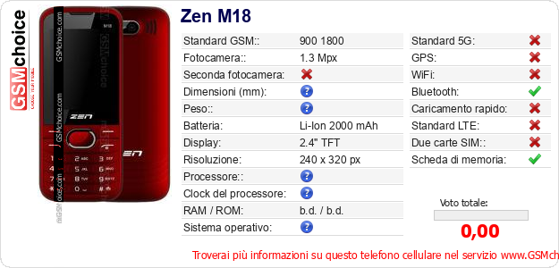 Dati del telefono cellulare Zen M18 sul tuo sito