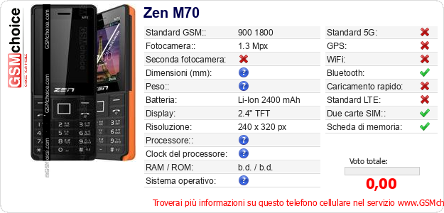 Dati del telefono cellulare Zen M70 sul tuo sito