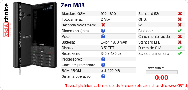 Dati del telefono cellulare Zen M88 sul tuo sito