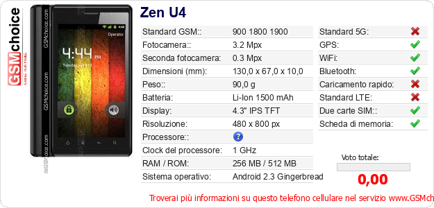 Dati del telefono cellulare Zen U4 sul tuo sito