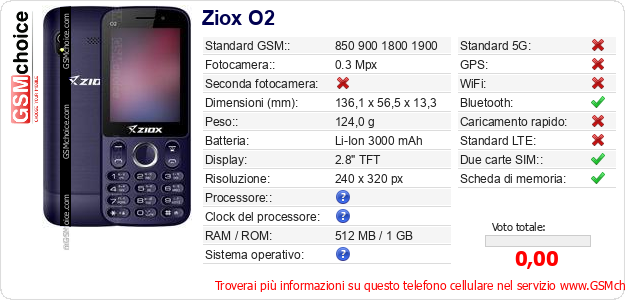 Dati del telefono cellulare Ziox O2 sul tuo sito