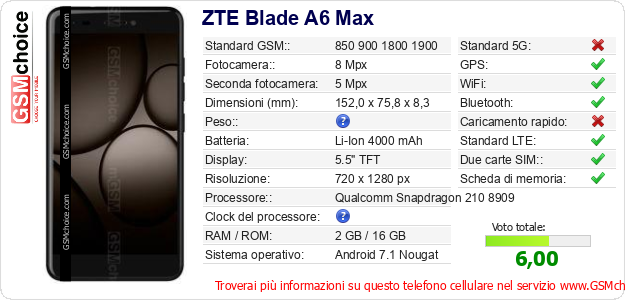 Dati del telefono cellulare ZTE Blade A6 Max sul tuo sito
