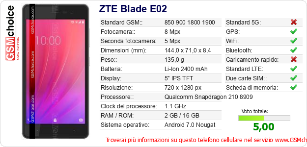 Dati del telefono cellulare ZTE Blade E02 sul tuo sito