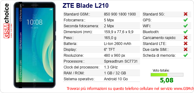 Dati del telefono cellulare ZTE Blade L210 sul tuo sito