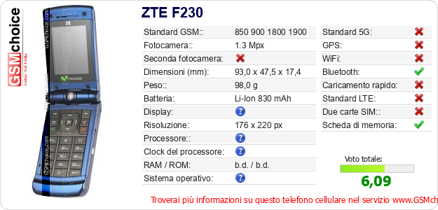 Dati del telefono cellulare ZTE F230 sul tuo sito