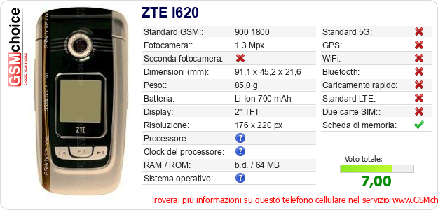 Dati del telefono cellulare ZTE I620 sul tuo sito