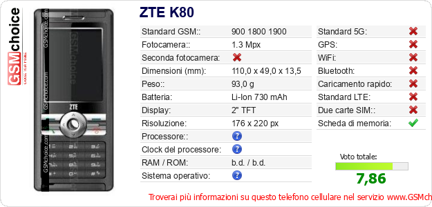 Dati del telefono cellulare ZTE K80 sul tuo sito