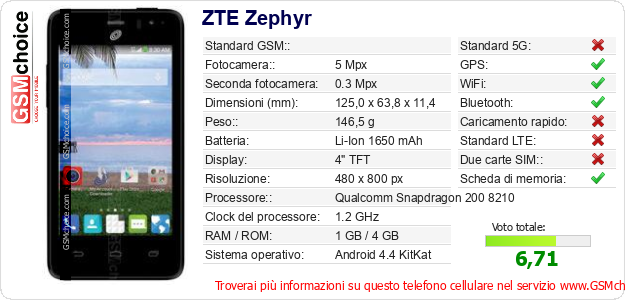 Dati del telefono cellulare ZTE Zephyr sul tuo sito