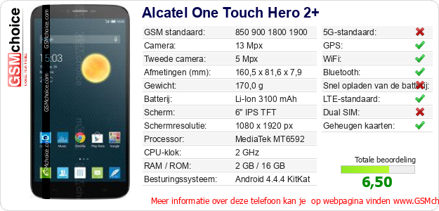 Gegevens van de telefoon Alcatel One Touch Hero 2+ op jouw webpagina