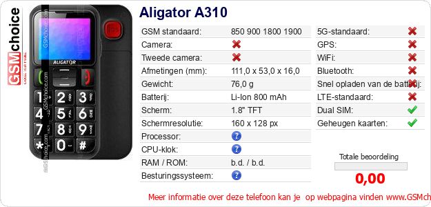 Gegevens van de telefoon Aligator A310 op jouw webpagina