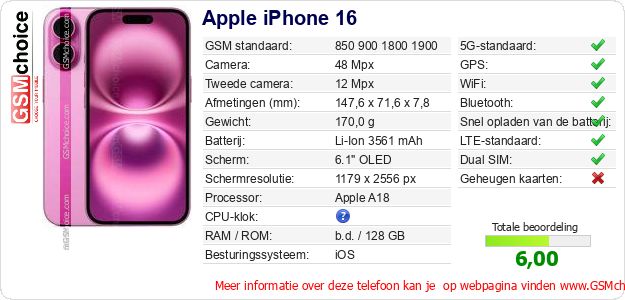 Gegevens van de telefoon Apple iPhone 16 op jouw webpagina