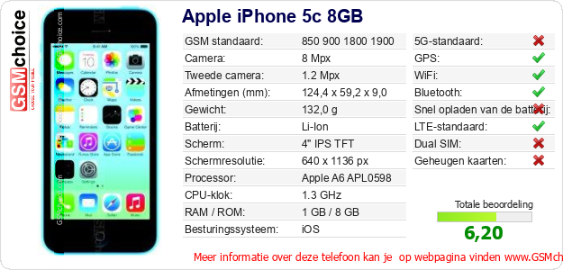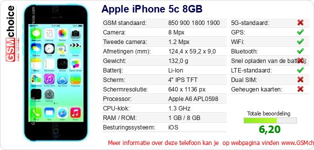 Gegevens van de telefoon Apple iPhone 5c 8GB op jouw webpagina