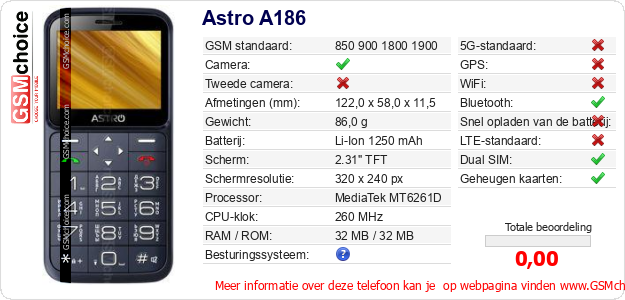 Gegevens van de telefoon Astro A186 op jouw webpagina