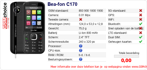 Verkoop je op ebay.com? Heb je jouw eigen webpagina? Als je de basisgegevens over Bea-fon C170 ergens wilt publiceren, dan is het heel simpel. Het is voldoende om deze code te kopiëren en op jouw webpagina te plakken:Als je deze code plakt, dan wordt de onderstaande afbeelding getoond: