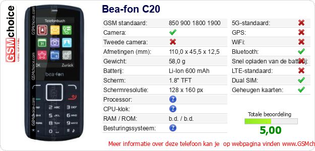 Verkoop je op ebay.com? Heb je jouw eigen webpagina? Als je de basisgegevens over Bea-fon C20 ergens wilt publiceren, dan is het heel simpel. Het is voldoende om deze code te kopiëren en op jouw webpagina te plakken:Als je deze code plakt, dan wordt de onderstaande afbeelding getoond: