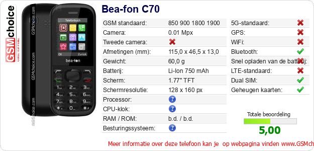 Verkoop je op ebay.com? Heb je jouw eigen webpagina? Als je de basisgegevens over Bea-fon C70 ergens wilt publiceren, dan is het heel simpel. Het is voldoende om deze code te kopiëren en op jouw webpagina te plakken:Als je deze code plakt, dan wordt de onderstaande afbeelding getoond: