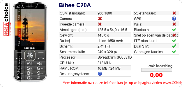 Gegevens van de telefoon Bihee C20A op jouw webpagina