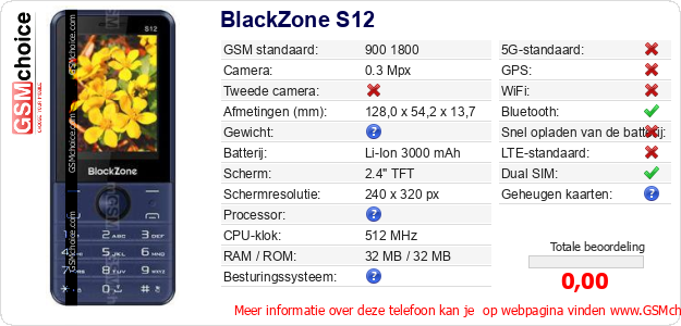 Gegevens van de telefoon BlackZone S12 op jouw webpagina