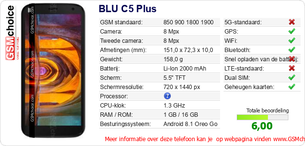 Verkoop je op ebay.com? Heb je jouw eigen webpagina? Als je de basisgegevens over BLU C5 Plus ergens wilt publiceren, dan is het heel simpel. Het is voldoende om deze code te kopiëren en op jouw webpagina te plakken:Als je deze code plakt, dan wordt de onderstaande afbeelding getoond: