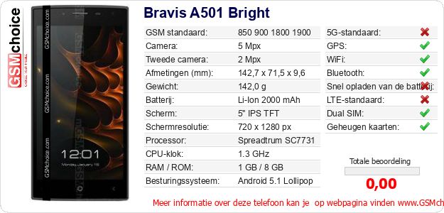Gegevens van de telefoon Bravis A501 Bright op jouw webpagina