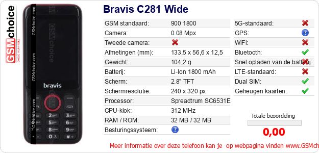 Gegevens van de telefoon Bravis C281 Wide op jouw webpagina