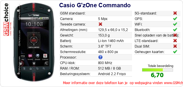 Gegevens van de telefoon Casio G'zOne Commando op jouw webpagina